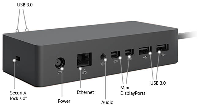 1x 3.5mm (4-pin), 1x DC connector, 1x Microfoon, 2x Mini DisplayPort, 1x RJ45, 4x USB 3.2 (Gen1, 5Gb/s), 4x USB 3.2 (Gen1, 5Gb/s) type-A
